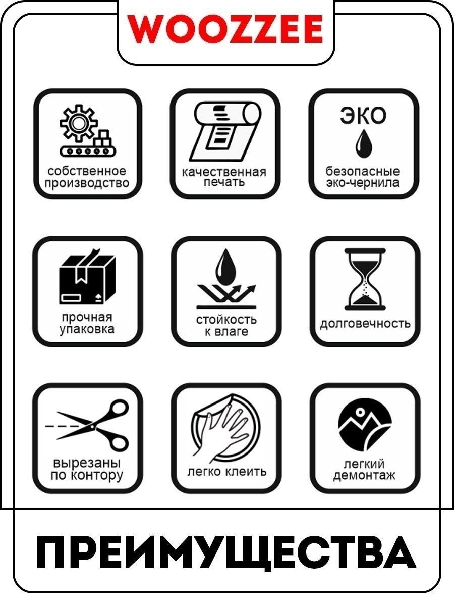 Панно наклейки изготовлены из влагостойкого винилового материала, который долговечен и легок в уходе. Они водостойкие и не выгорают под воздействием солнца, поэтому их можно использовать даже в ванной комнате или на даче. Кроме того, они не оставляют следов при снятии, поэтому вы можете изменять декор дома в любое время.